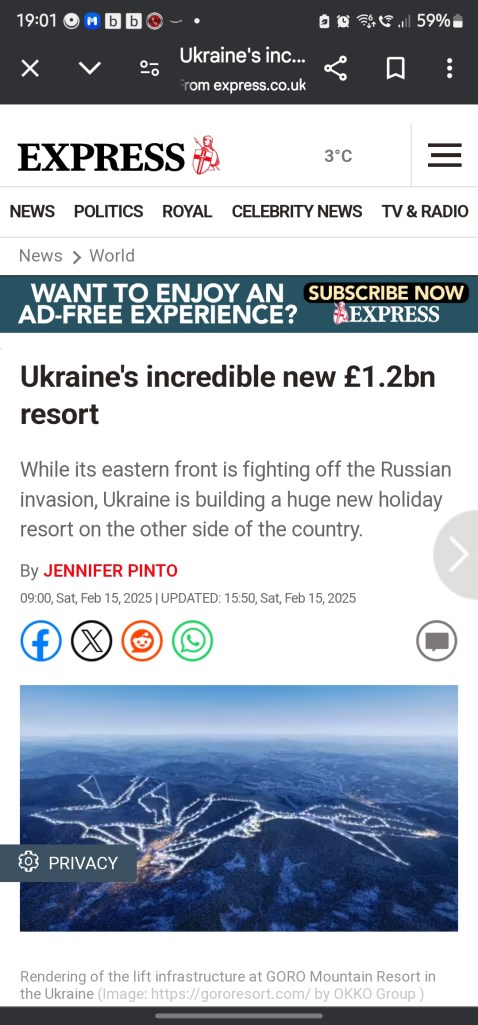 It’s now confirmed by news outlets across the world, including the UK’s MSM and Ukraines own media, that Ukraine is investing at current figures £1.4 billion into ….. not defense, but tourism, in the shape of a new ski resort.
